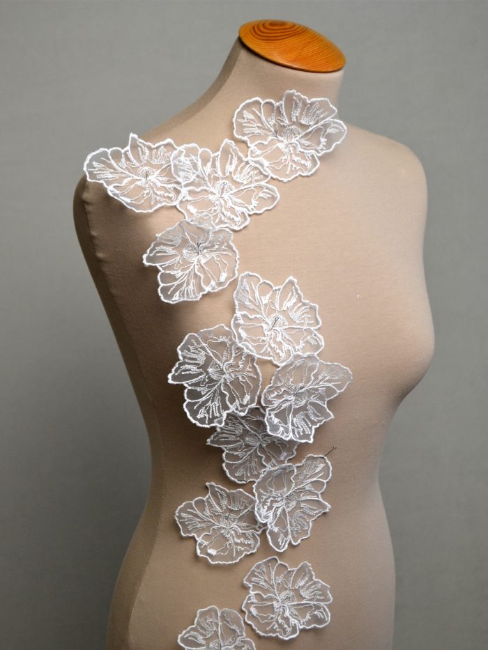 Пришивные аппликации Цветы – это небольшие кружевные элементы для создания объемных форм. 3D фрагменты отлично сочетаются с аппликациями и широко используются в костюмах для бальных танцев и художественной гимнастики, подходят для сценических костюмов, а также свадебной и вечерней моды. Представлены в широкой палитре расцветок и подходят для окрашивания различными красками.