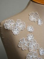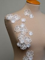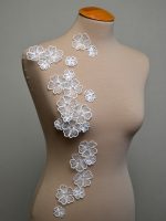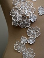 Пришивные аппликации Цветы – это небольшие кружевные элементы для создания объемных форм. 3D фрагменты отлично сочетаются с аппликациями и широко используются в костюмах для бальных танцев и художественной гимнастики, подходят для сценических костюмов, а также свадебной и вечерней моды. Представлены в широкой палитре расцветок и подходят для окрашивания различными красками.