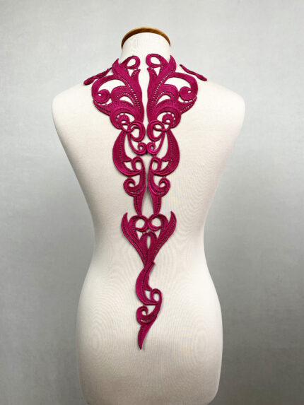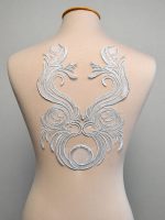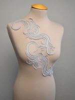 Кружевная аппликация — кружевной элемент на сетке, вырезанный по контуру. Обладает изящными формами и детализированными узорами. Кружевные (пришивные) аппликации имеют различные фактуры и плотность вышивки, хорошо подходят для танцевальных, спортивных и сценических костюмов, а также для вечерних и свадебных платьев. Представлены в широкой палитре расцветок и подходят для окрашивания красками.