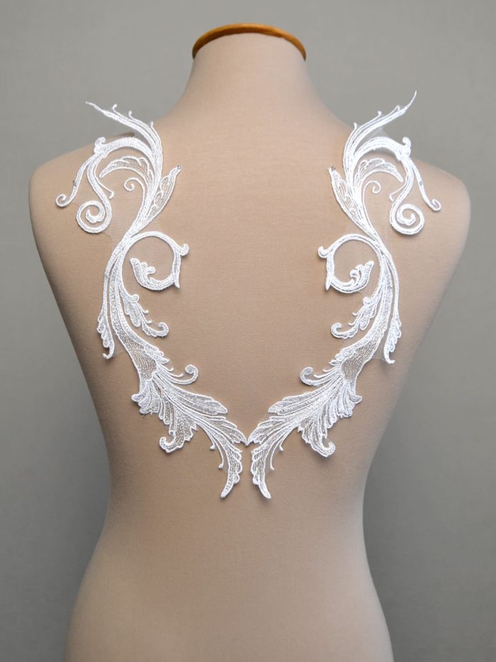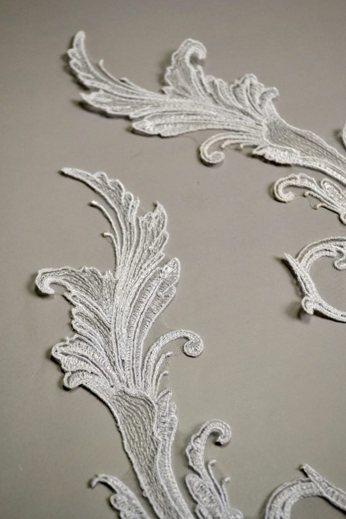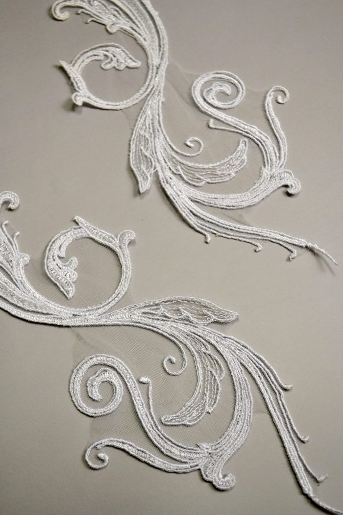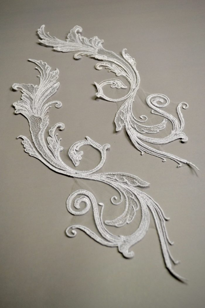 Аппликации — кружевные элементы на сетке, вырезанные по контуру. Имеют различные фактуры и плотность вышивки, подходят для окрашивания.
