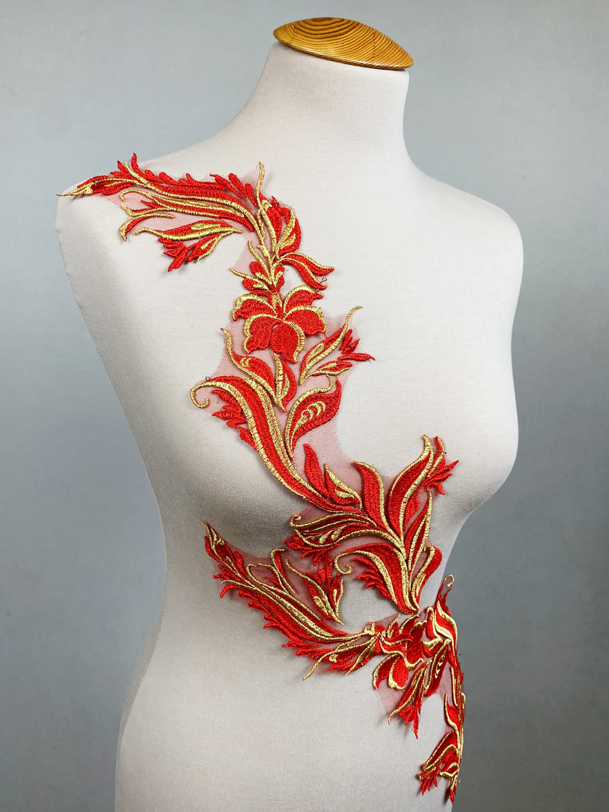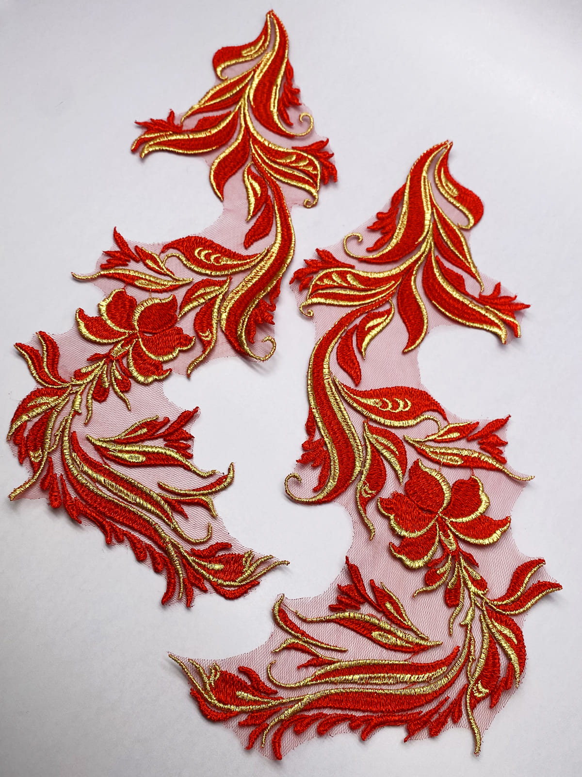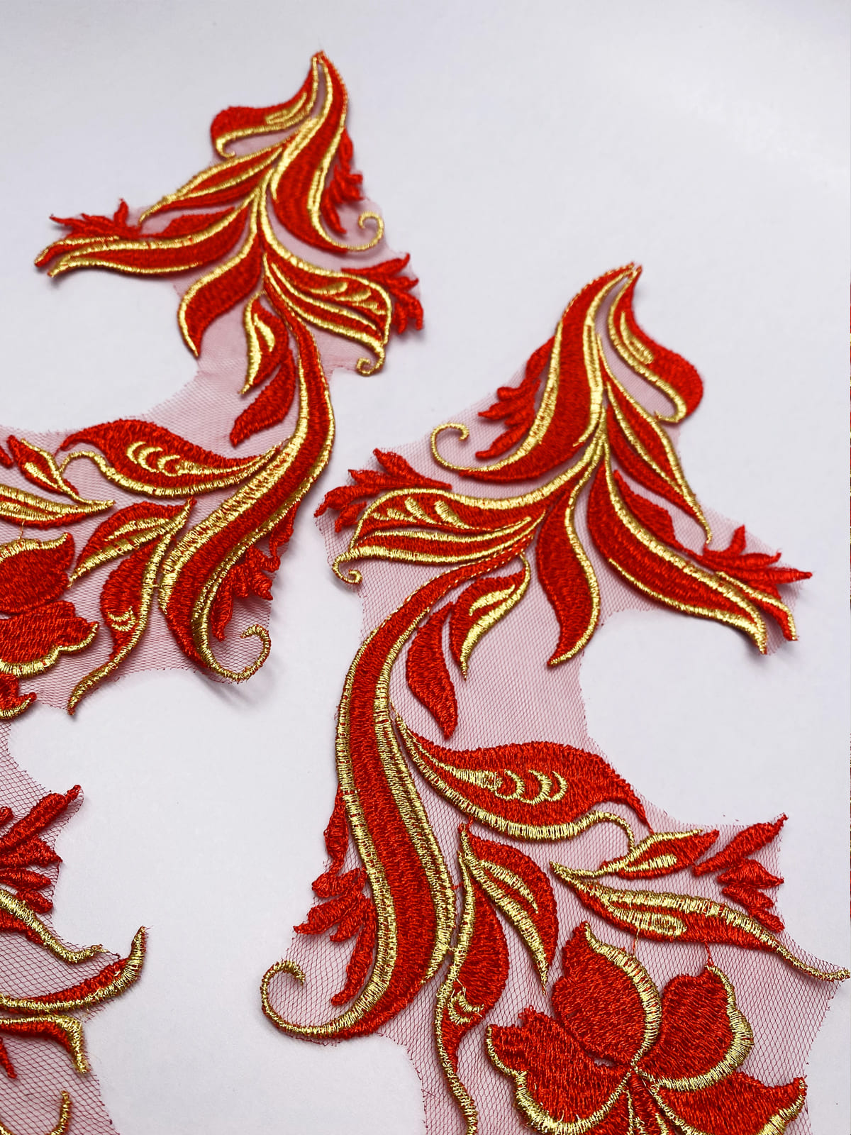 Комплект кружевных аппликаций в русском народном стиле для декорирования спортивных бальных платьев, художественной гимнастики, а так же сценических нарядов. Выполнен в красно-золотом цвете.