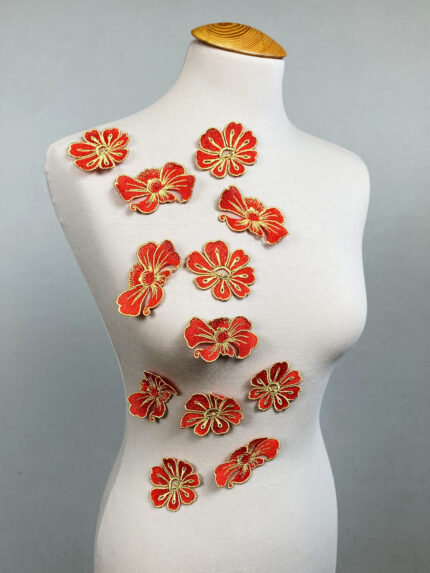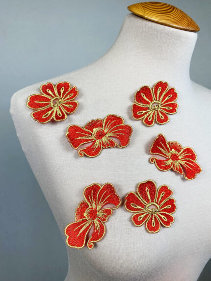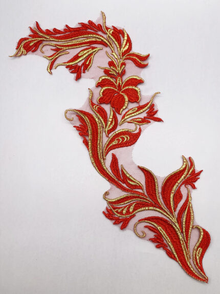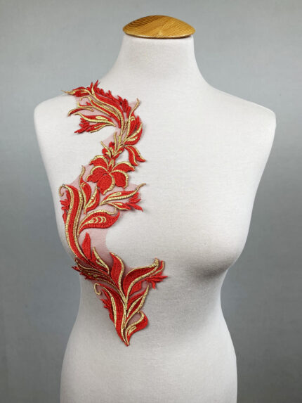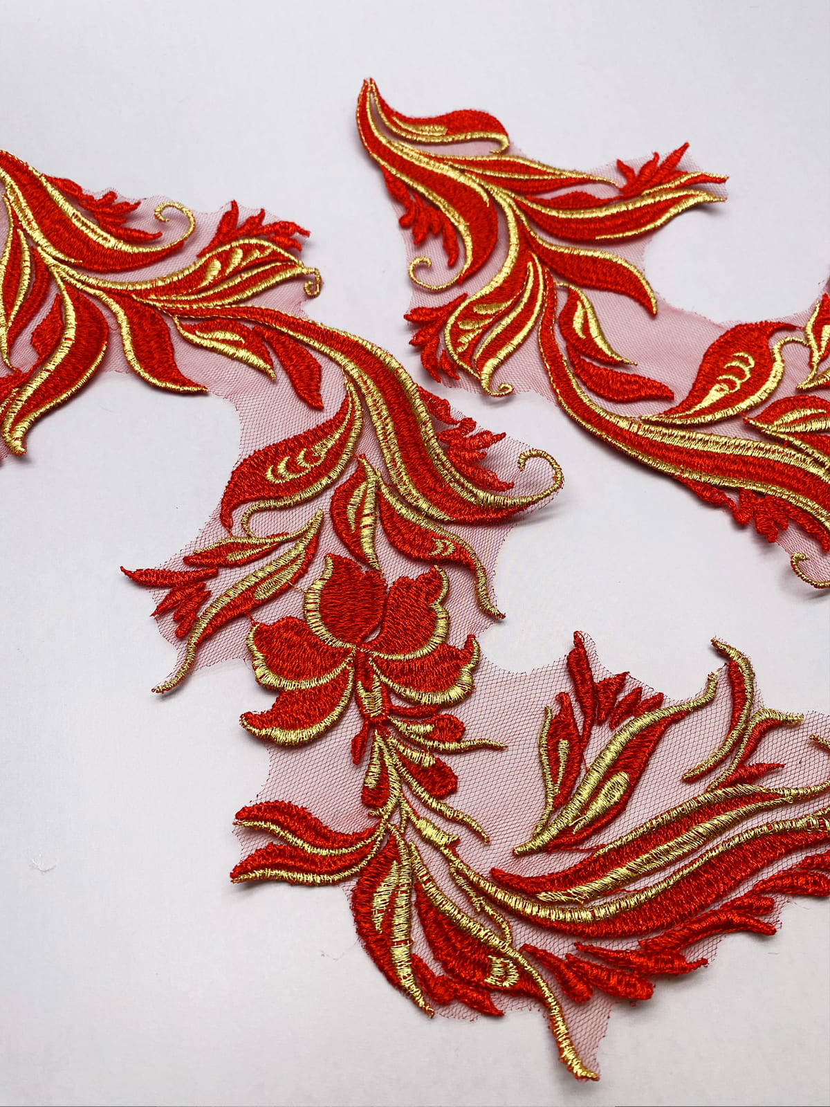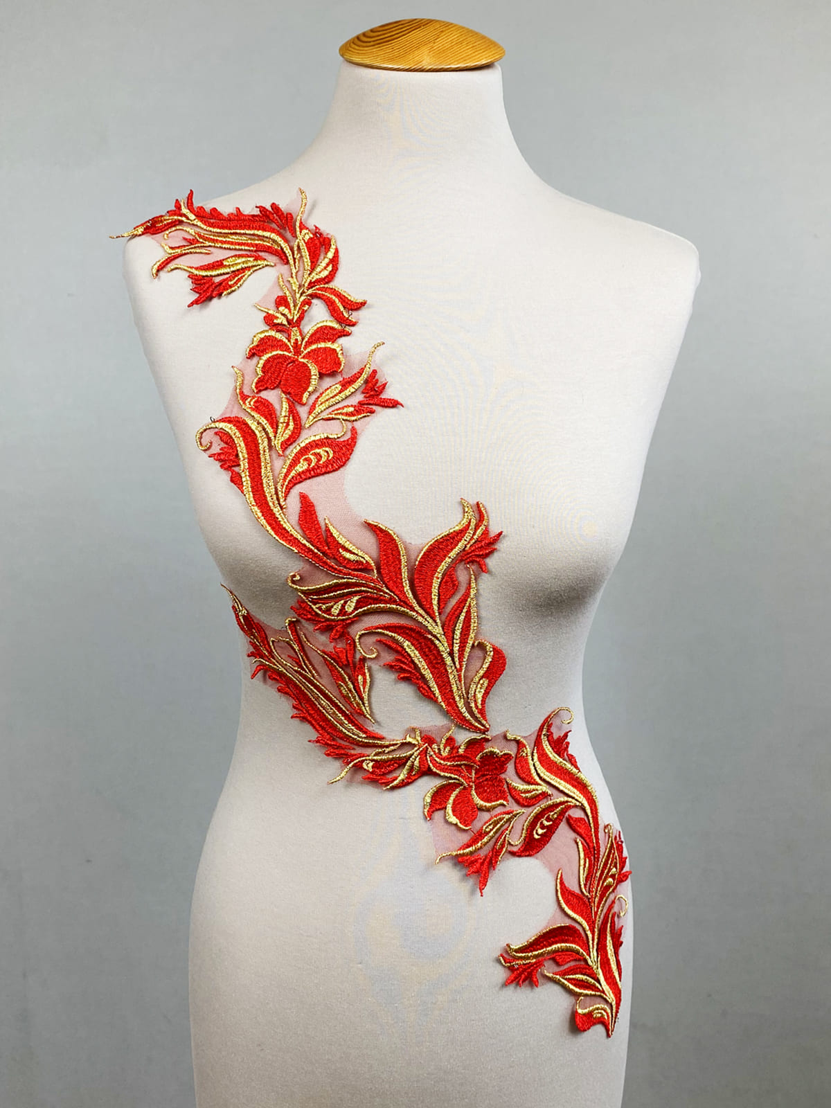 Комплект кружевных аппликаций в русском народном стиле для декорирования спортивных бальных платьев, художественной гимнастики, а так же сценических нарядов. Выполнен в красно-золотом цвете.